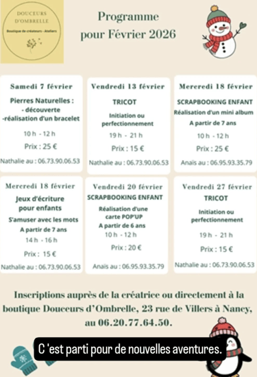 Février 2026 : un mois d'ateliers créatifs à la boutique Douceurs d’Ombrelle à Nancy en Lorraine