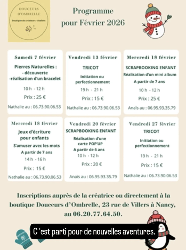 Le mois de février s’annonce riche en créativité, partage et douceur à la boutique Douceurs d’Ombrelle, à Nancy. Petits et grands sont invités à venir découvrir ou approfondir des activités manuelles et créatives dans une ambiance conviviale et bienveillante, comprenant un programme d'ateliers pour les enfants durant les vacances scolaires.