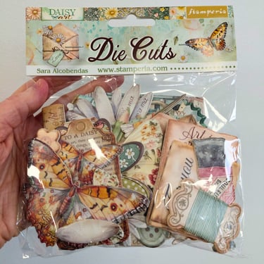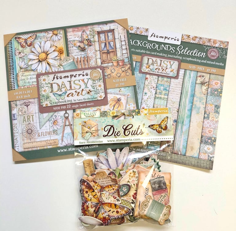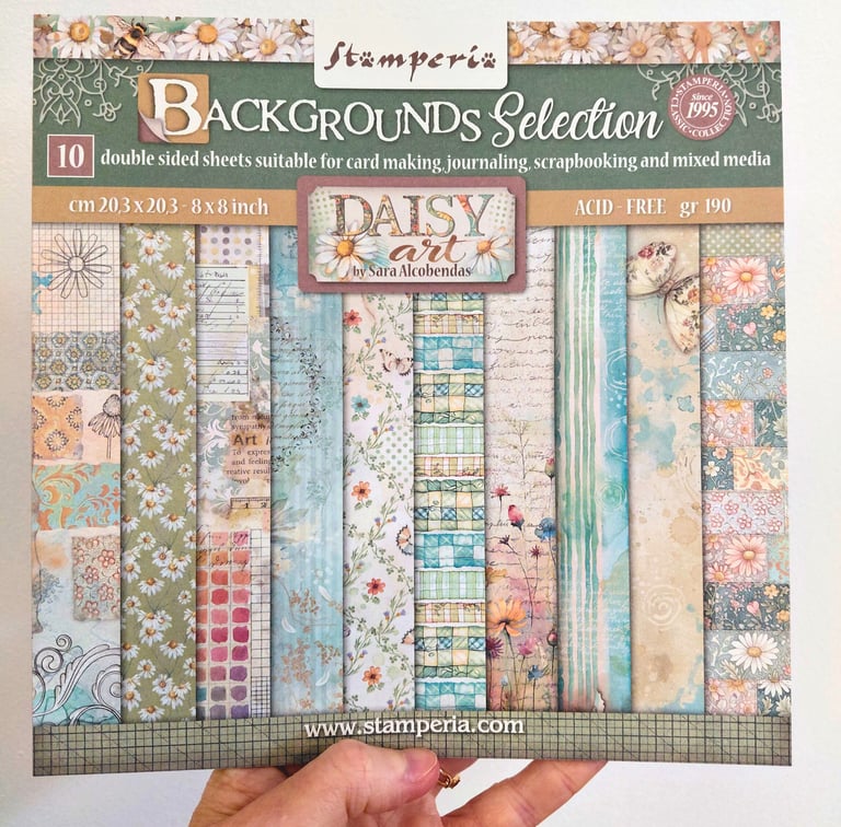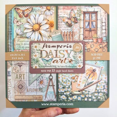Je cherchais une collection printanière, colorée et inspirante, pour créer des projets en lien avec mon amour pour les arts créatifs. La collection propose différents papiers et accessoires, tous fabriqués en Italie, offrant une grande liberté d’expression pour laisser parler sa créativité. J’ai donc choisi d’explorer la collection « Daisy Art » de Stamperia, une marque bien connue des scrapeur(se)s et dont la réputation n’est plus à faire.
